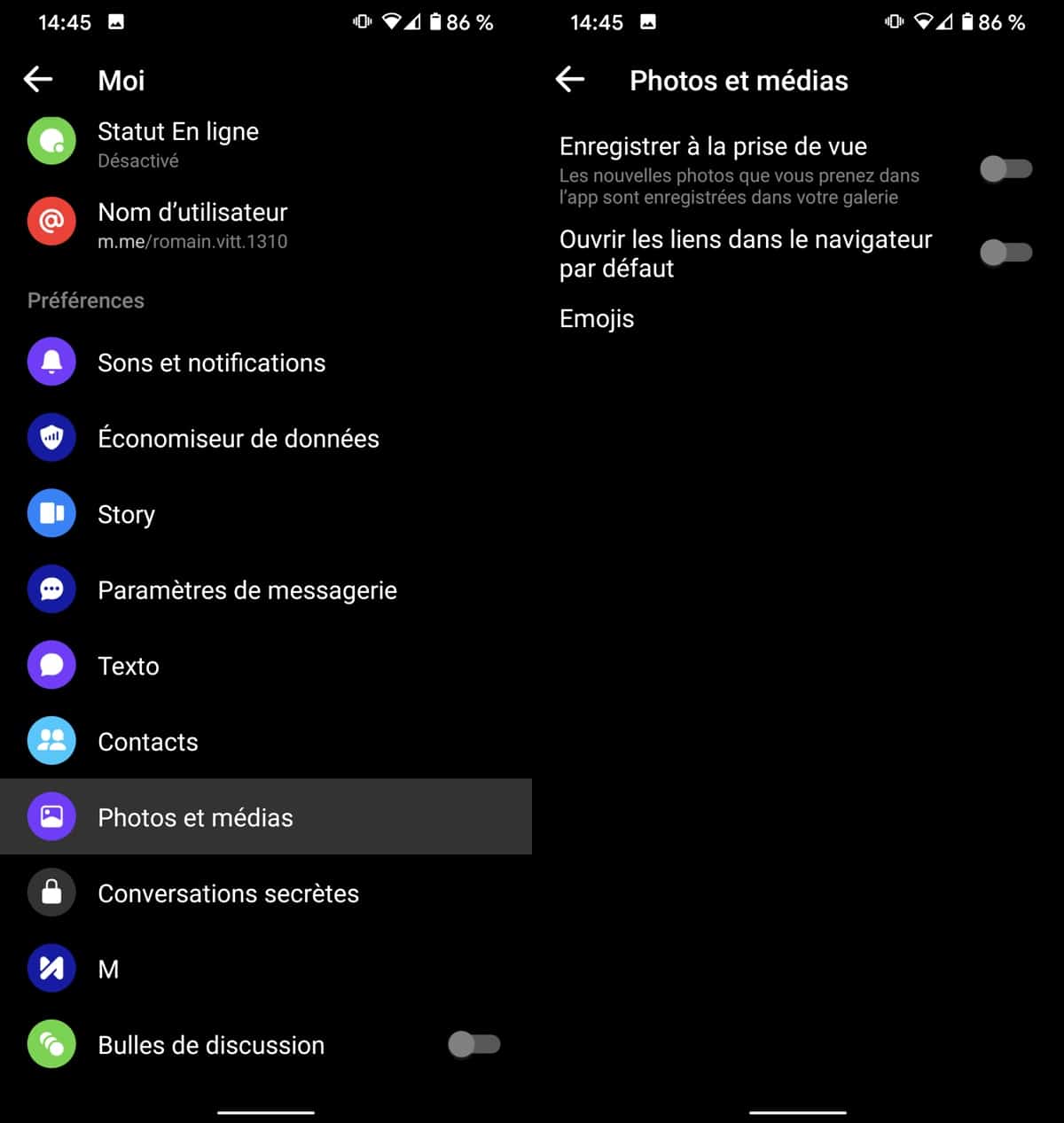 Pour éviter que toutes les images reçues viennent s’empiler dans votre galerie, allez dans votre profil, puis « Photos et médias ». Ici, vous pouvez refuser l’enregistrement automatique. Vos albums resteront mieux rangés, sans surprises inattendues à la prochaine ouverture de la galerie.
