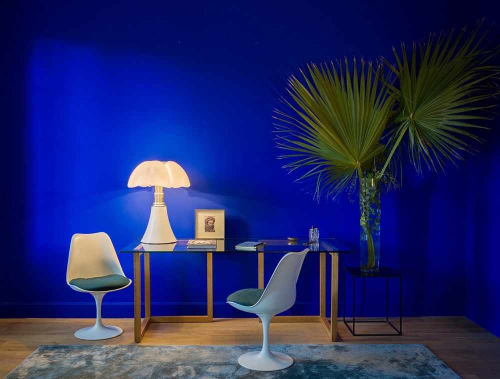 Au bureau, une lampe Klein bleu apporte un souffle énergisant et apaisant à la fois. Si la peur d’en faire trop persiste, quelques accessoires suffisent à installer l’ambiance.